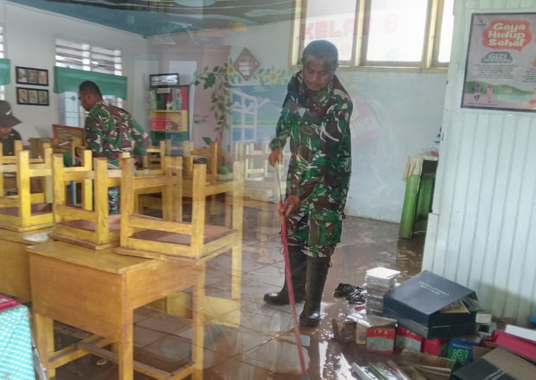 Koramil 1315-04 Tibawa Bersama Warga Dan Yonif TP 824 Moea Gotong Royong Bersihkan SDN Pasca Banjir Kecamatan Tibawa