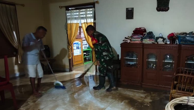 Babinsa Koramil 1315-04/Tibawa Gerak Cepat Tangani Banjir Akibat Hujan Deras di Kecamatan Tibawa