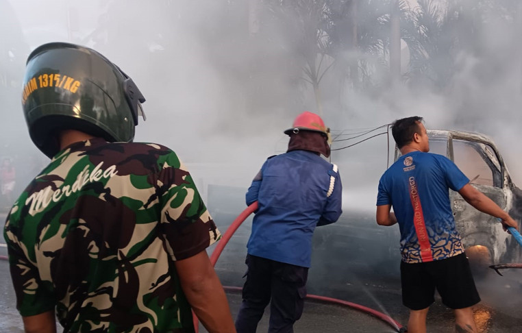 Babinsa Koramil 1315-02 Limboto dan Damkar Gorontalo Padamkan Kebakaran Mobil Carry di Desa Tunggulo